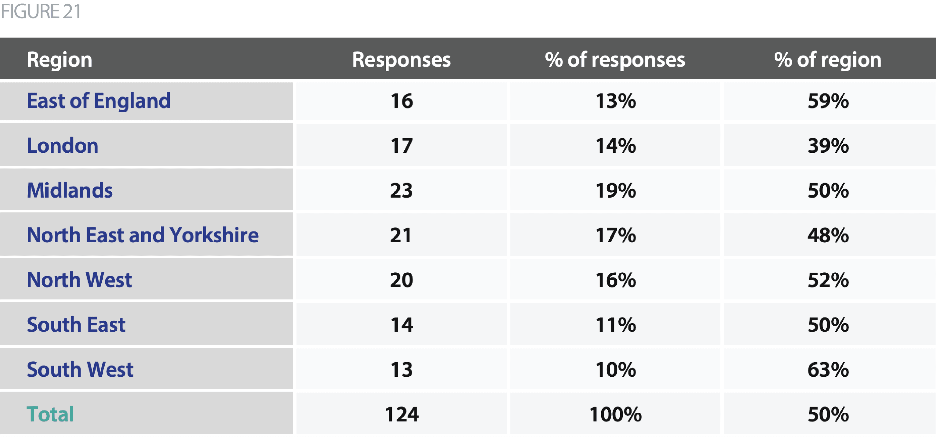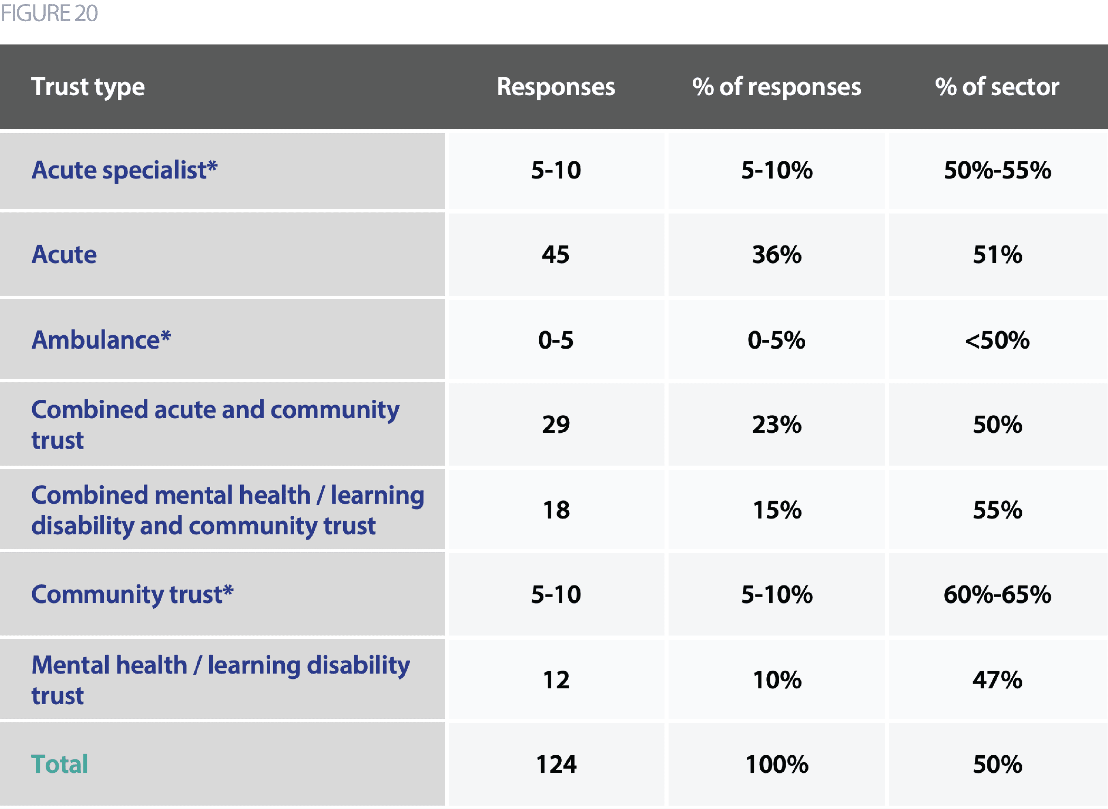 - We received 124 responses to the survey from 104 unique trusts. This accounts for 50% of the sector (206 trusts in England).