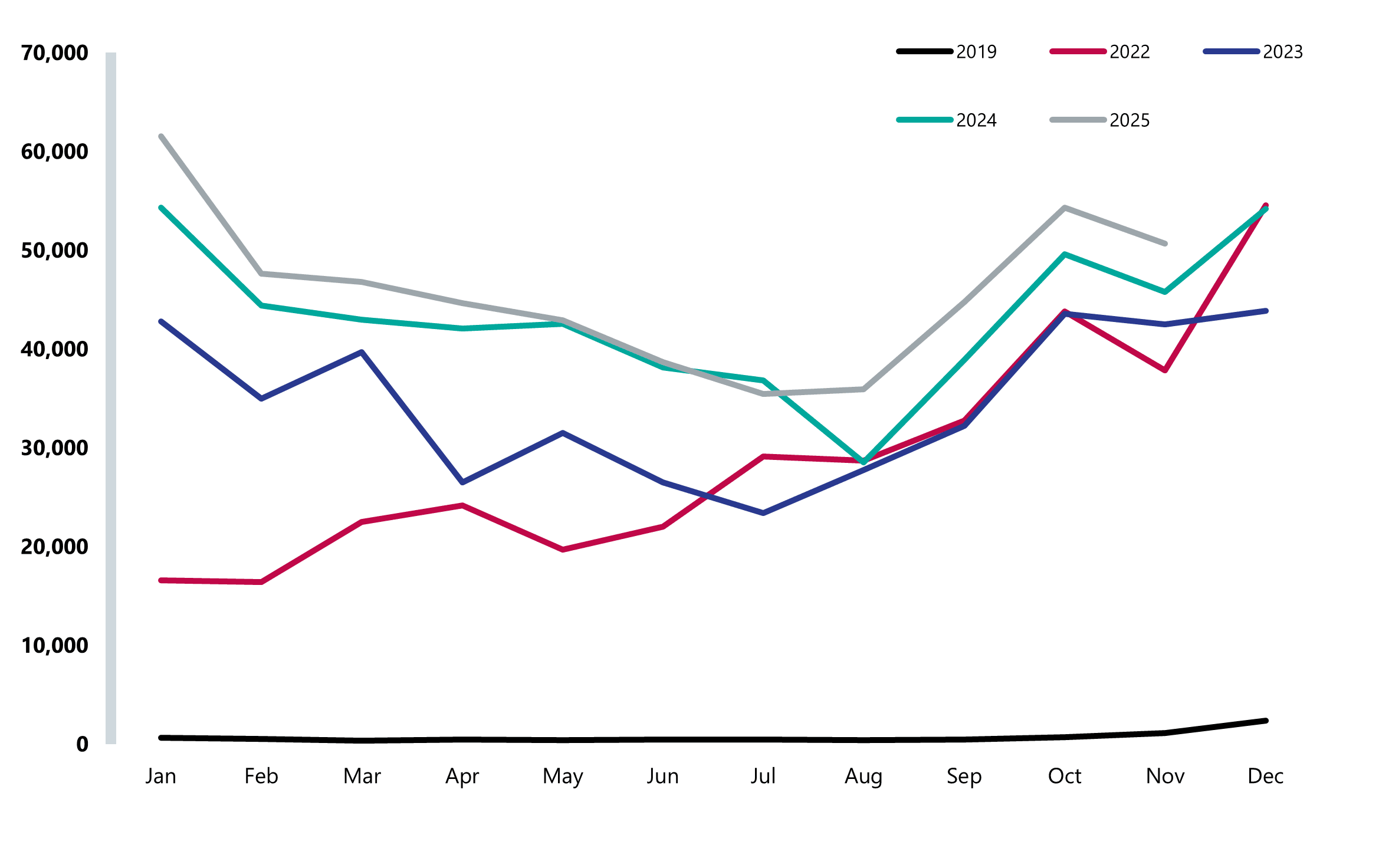 - In November, 50,650 patients waited at least 12 hours from the decision to admit to admission, a concerning 11% increase compared to last year and 45 times higher than November 2019.