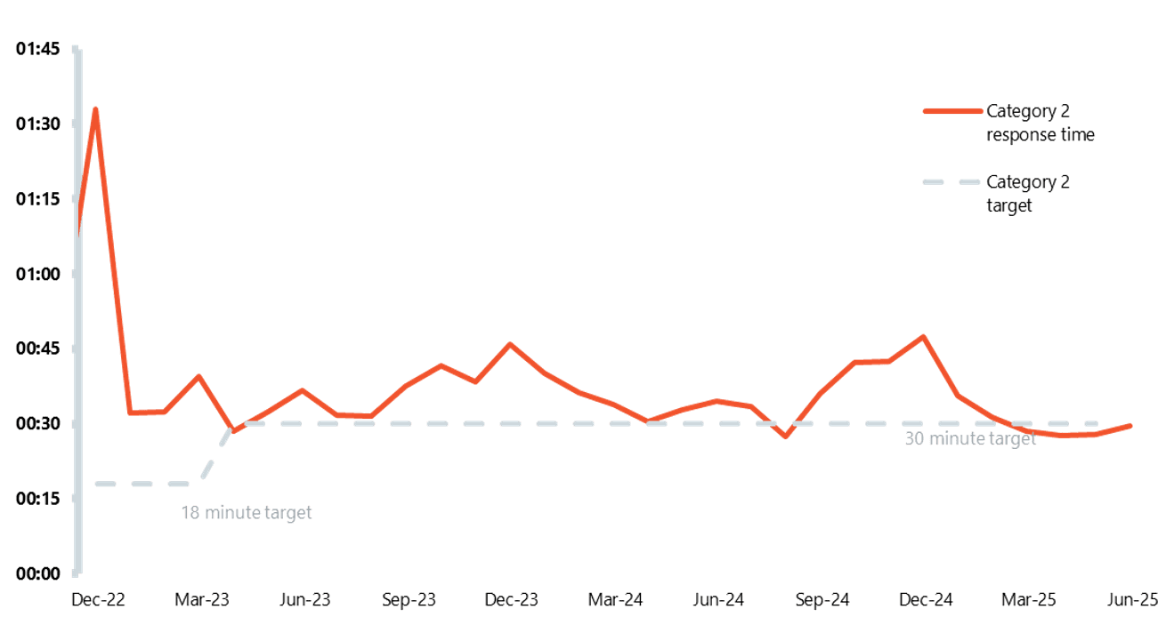 Category 2 response times met the national recovery target for the fourth consecutive month. However, the average category 1 response time was slower than in the previous three months.