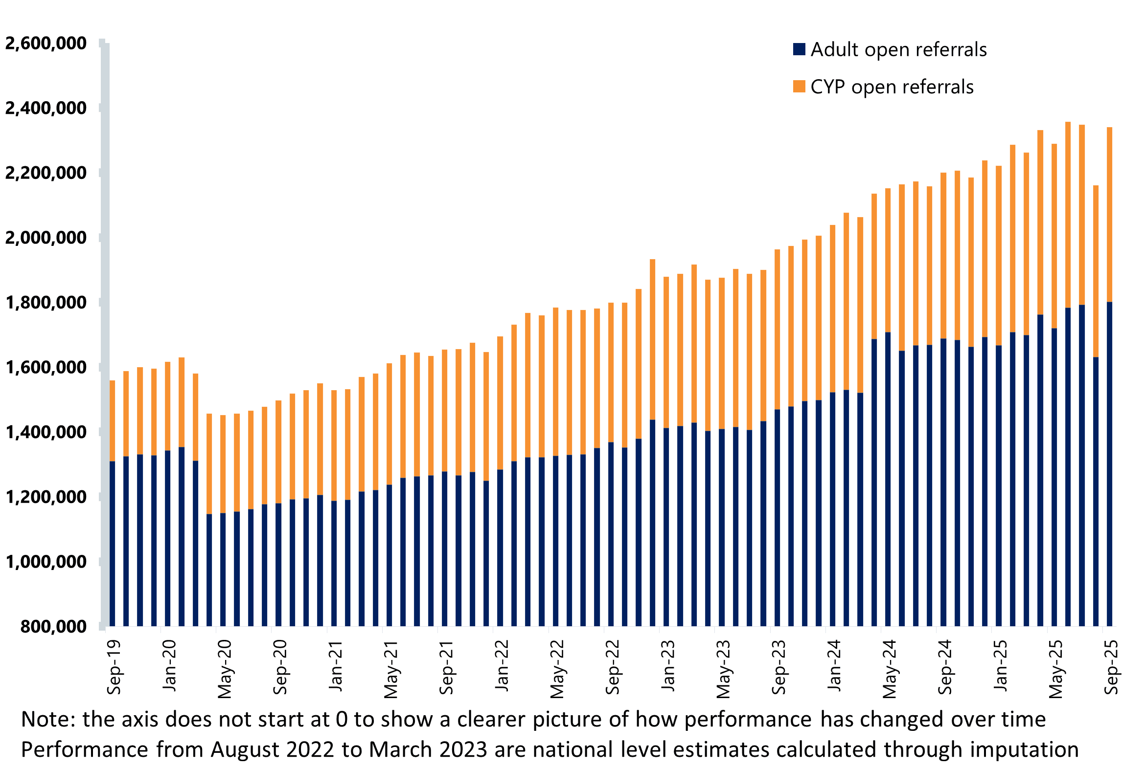 - There were 2.34 million open referrals to mental health services, the third highest figure on record and 47% above pre-pandemic levels. There were 1.8 million adult open referrals – the highest number on record.