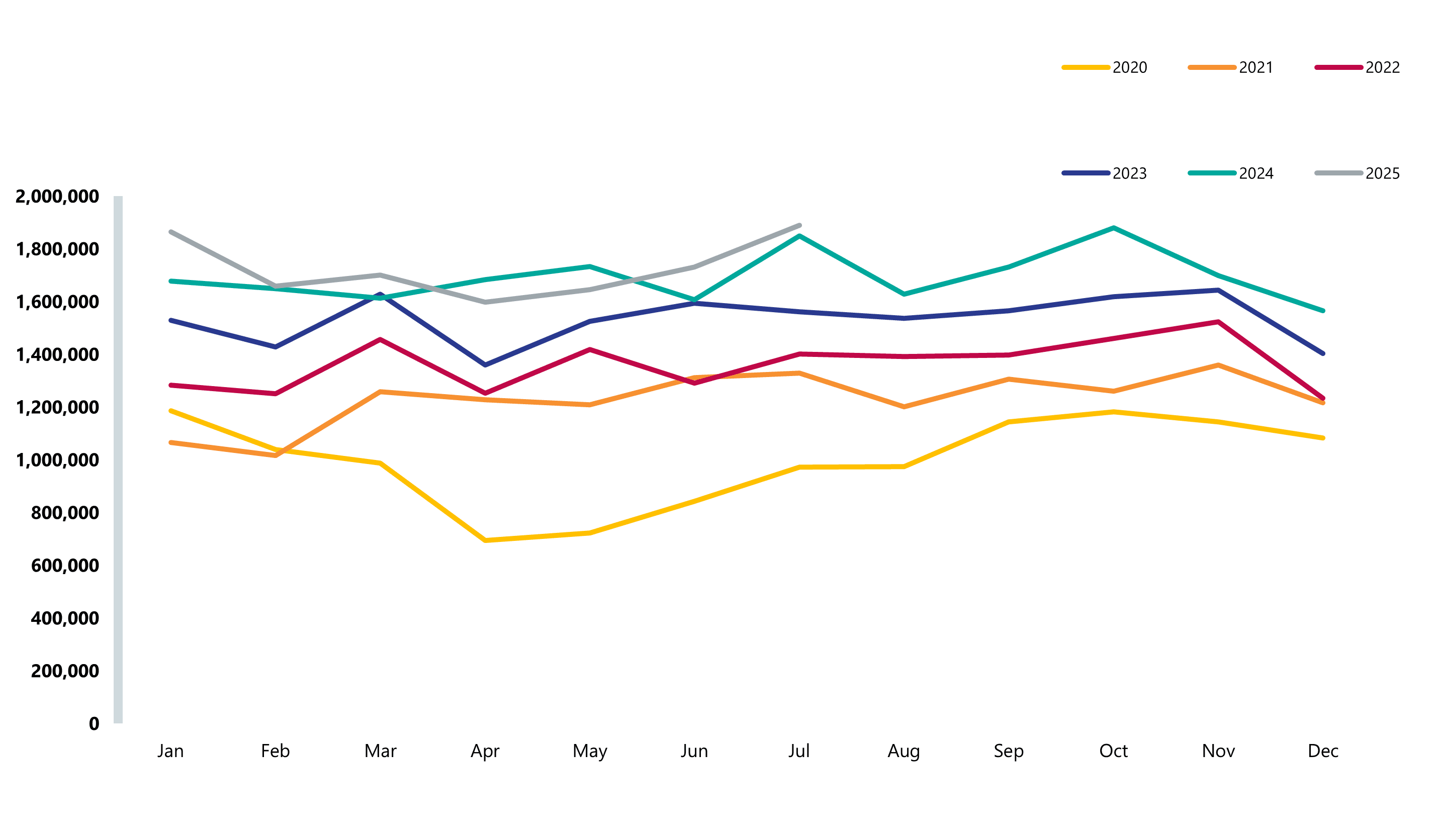 - In July 2025, there were 1.89 million referrals received – the highest figure on record and an increase of 2.2% since last year. Referrals have risen by 66% compared to six years ago, before the pandemic (July 2019). Child referrals are down by 7% compared to last year, whereas adult referrals (aged 19-64) and those aged 65+ are up by 4%.