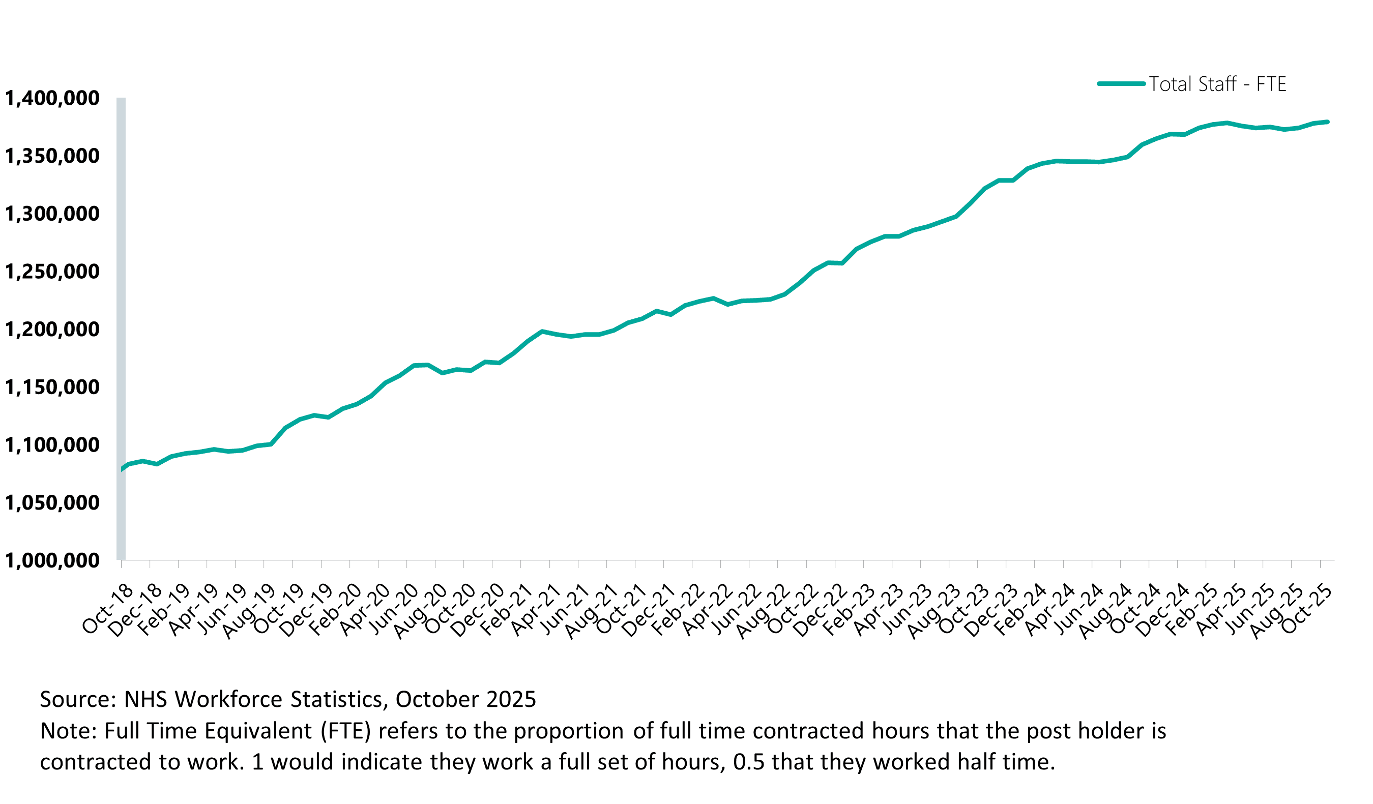 - Workforce: The total NHS workforce stood at 1.38 million in October 2025, 1.1% more than in October 2024. This compares with a 3.3% rise between October 2023 and October 2024, indicating that workforce growth has slowed over the past year.