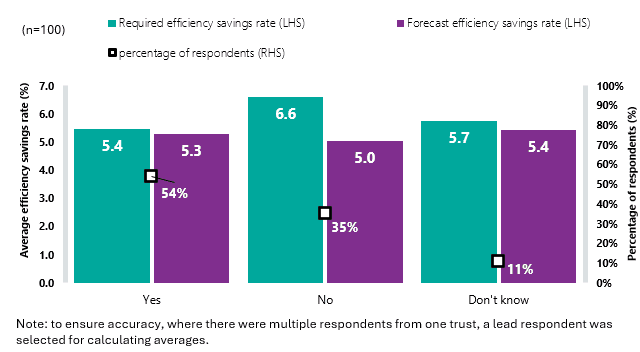 - The sample of trusts we surveyed are required to deliver an average 5.9% efficiency savings rate in 2025/26, but forecast achieving only 5.2%, leaving a 0.7 percentage point gap.