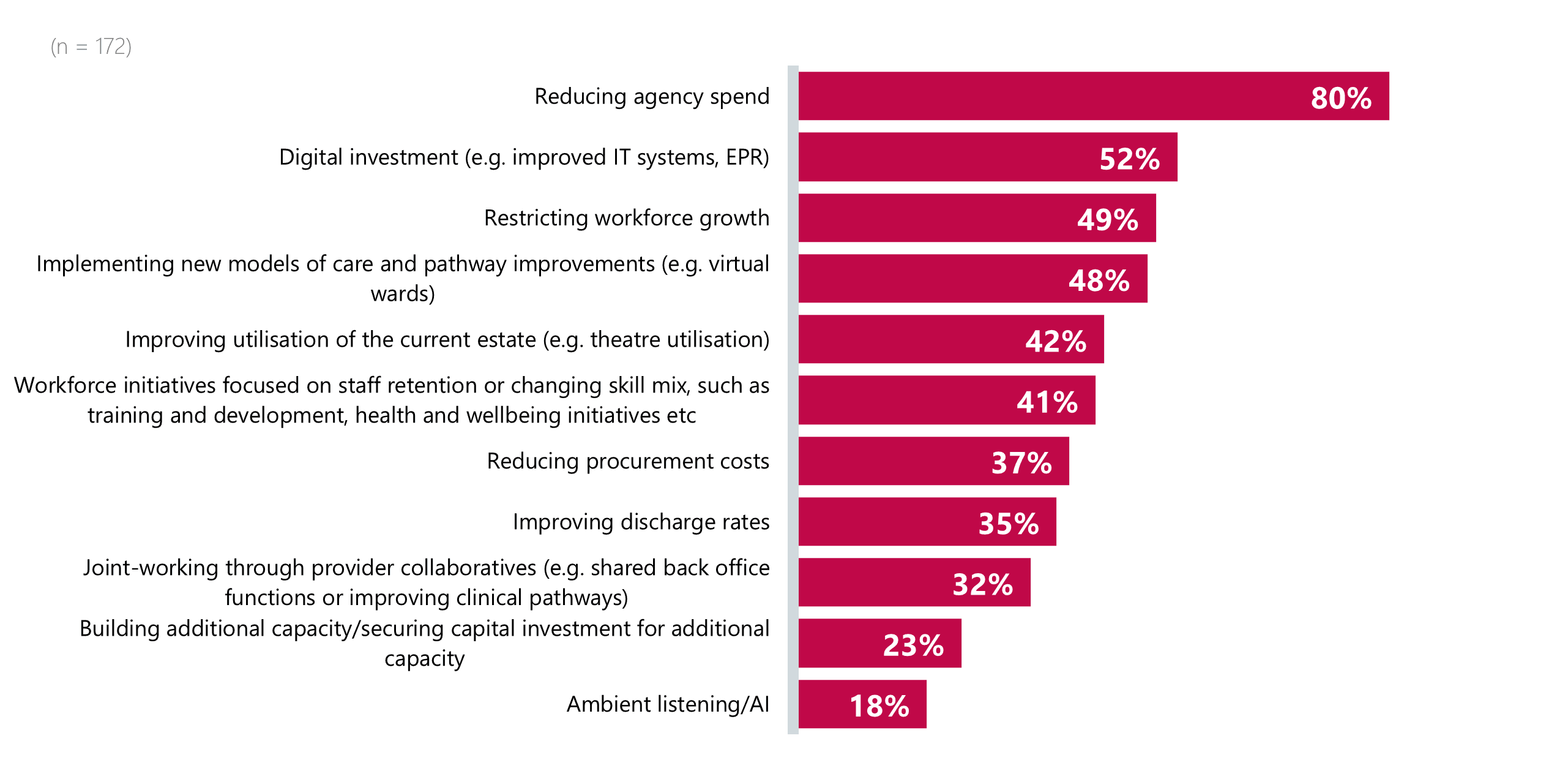 - Financial and operational measures: Most trusts are tightening control on non-clinical spend (84%), renegotiating supplier contracts (70%), and collaborating with neighbouring trusts (66%).
