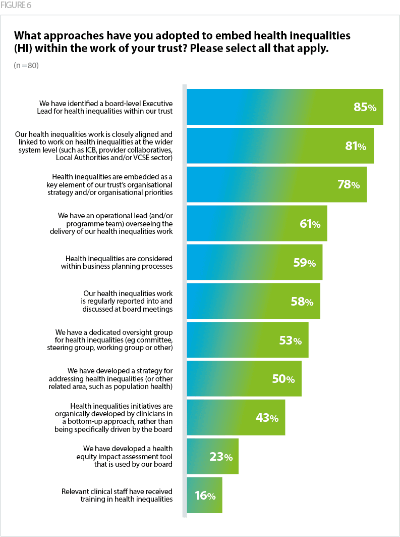 It is encouraging to see that the majority of trusts have board commitments and established internal structures to oversee their health inequalities work (Figure 6). The commitment is demonstrated through high responses to 'we have identified a board-level executive lead for health inequalities' (85%) and 'health inequalities are embedded as a key element of our trust's organisational strategy and/or organisational priorities' (78%). Feedback from executive leads highlighted that good practice involved reviewing data to inform the strategy development. Others have worked in partnership at place and system level to develop their strategy with wider system partners. The challenge noted for trusts relates to transforming strategy into action and implementation. A number of trusts reported a sense of feeling "stuck" in strategic mode, which involves lengthy discussions on long-term vision and aspirations rather than focusing on practical actions to address immediate concerns. It is important that trusts are enabled to transform their strategy into delivery by addressing the barriers that are set out in this report.